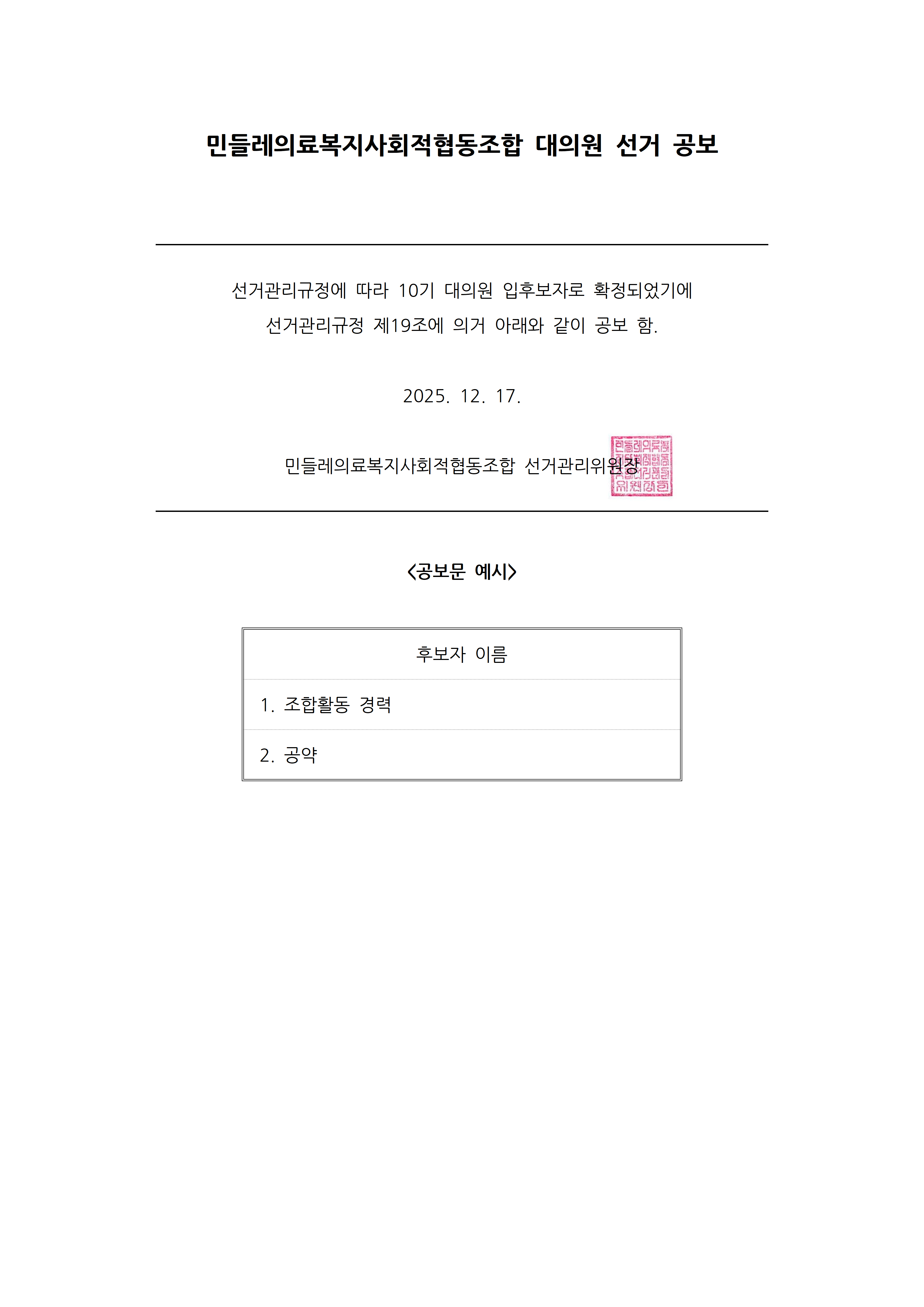 제10기 대의원 선거 입후보자 선거구별 공보